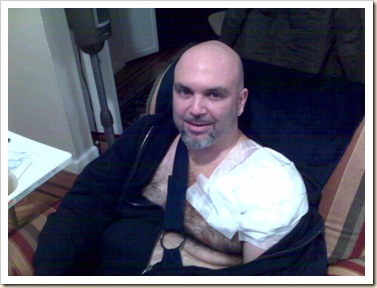 The following Tuesday, post-op day 6, I went back to see the surgeon. It was a brief visit. He took the stitches out, told me I could take my arm out of the sling once or twice a day to stretch my elbow and let my arm hang and keep my elbow from getting too stiff. After I asked, he said I could shower but returning to work was still not on my "To do..." list. Other than that, my job was to keep my immobilizer on 24/7, rest and go back to see him in three weeks.